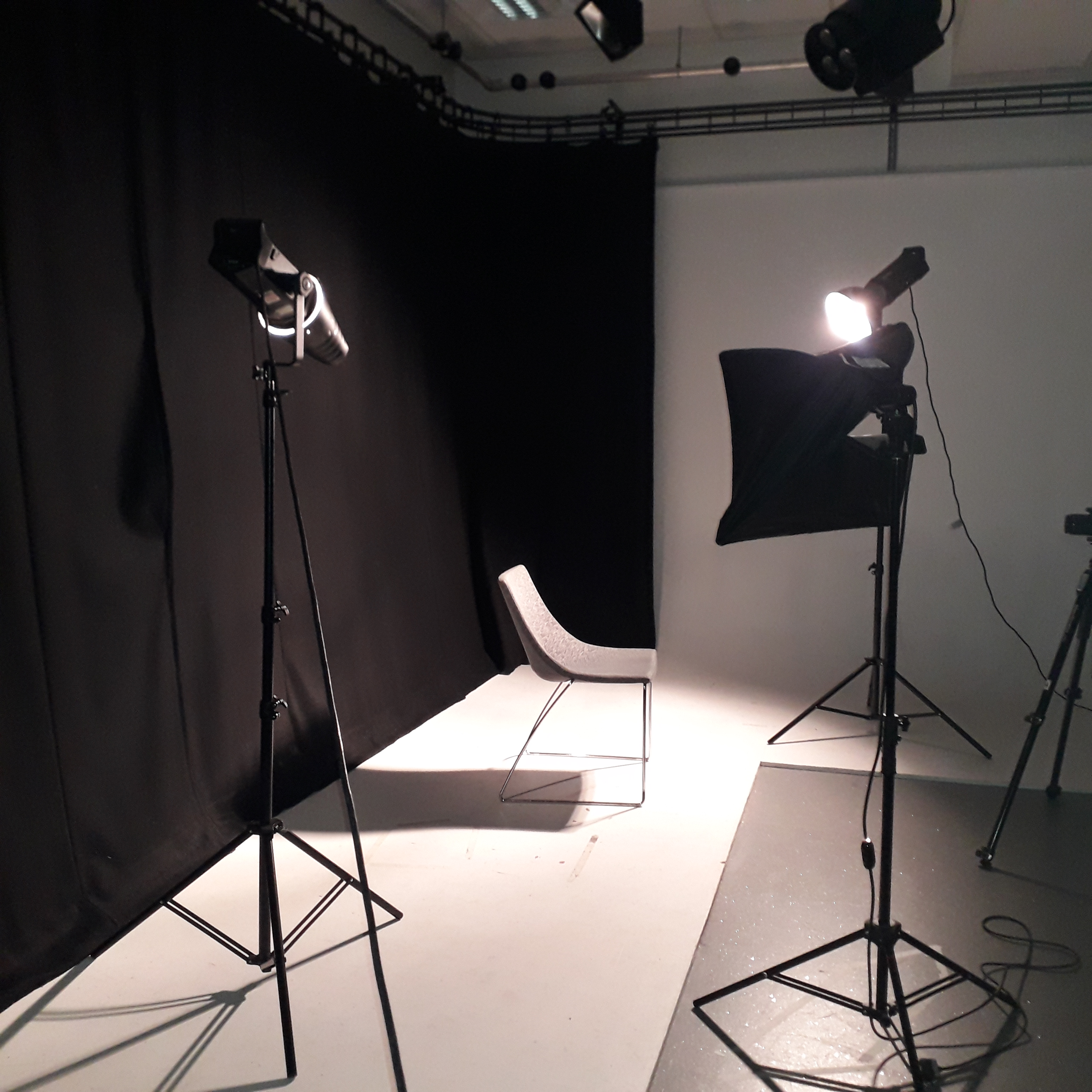 The reflector that you can see on the left hand side of the subject area positioned approximately at 90 degree right angle, tied behind a prop-up chair to hold it's weight and a collection of rope and string wrapped around two additional lamp posts that we where not using during the production area. This was done on purpose to maximize the amount of light we could get out of the reflector, I also distinctly chose a much larger reflector than what we needed as the wider the density of the reflector is, the more reduced splash back and shadow intake it creates. This proved to be much ideal that the previous set-up that I originally planned as it proved not only more plausible & piratical amongst the current studio setting, but also reduced the amount of electrical usage within the studio itself as only one true light source was used throughout the whole production. This also helped making out potential health & safety hazards far easier for my cooperative to make out, spot and target.